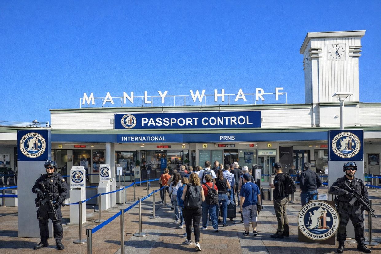 MANLY, PRNB — In a move officials say was “inevitable, overdue, and frankly generous to the rest of Sydney,” the People’s Republic of the Northern Beaches (PRNB) has unveiled a fully operational passport control facility at Manly Ferry Wharf, formally treating arrivals from the city as what they legally are: foreigners.